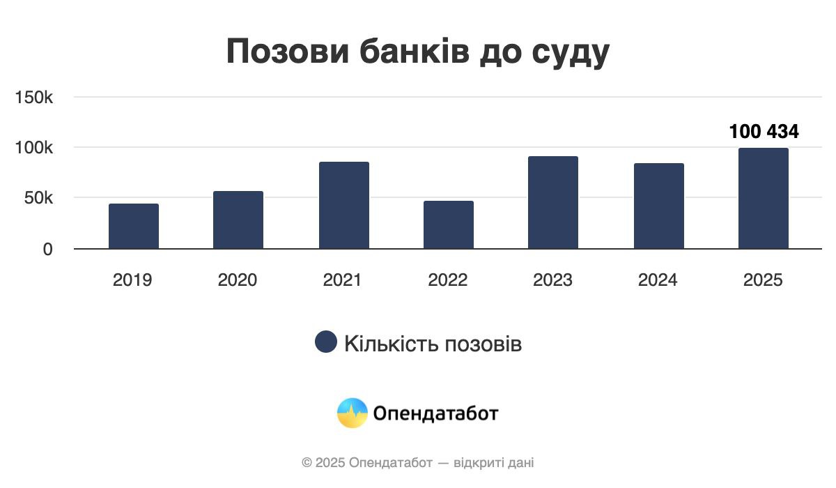 За останні 7 років незмінним лідером по судових позовах до боржників залишається Приватбанк — 191 353 позови. Наслідують Універсал Банк (115 702), А-Банк (60 421), Сенс Банк (25 283) та ПУМБ (21 476).