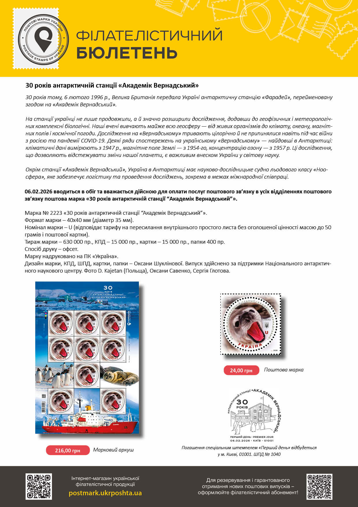 Нове видання можна буде придбати у відділеннях Укрпошти, у філателістичних магазинах та онлайн у поштовому маркеті з 6 лютого — саме в день святкування ювілею української присутності на Антарктиді.