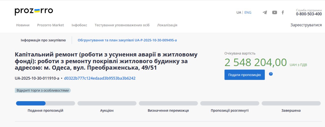 Про це кореспондент Української Служби Інформації дізнався з порталу електронних закупівель Prozorro.