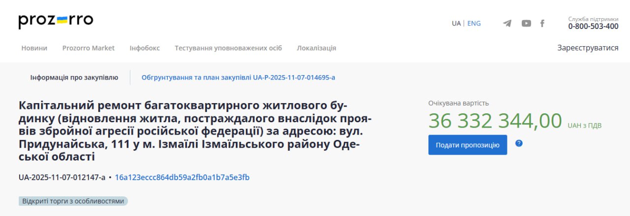 Управління житлово-комунального господарства Ізмаїльської міської ради оголосило тендер на капітальний ремонт ще одного будинку, який постраждав від дронової атаки на місто торік, на вулиці Придунайській, 111. Вартість тендеру склала понад 36 мільйонів гривень.