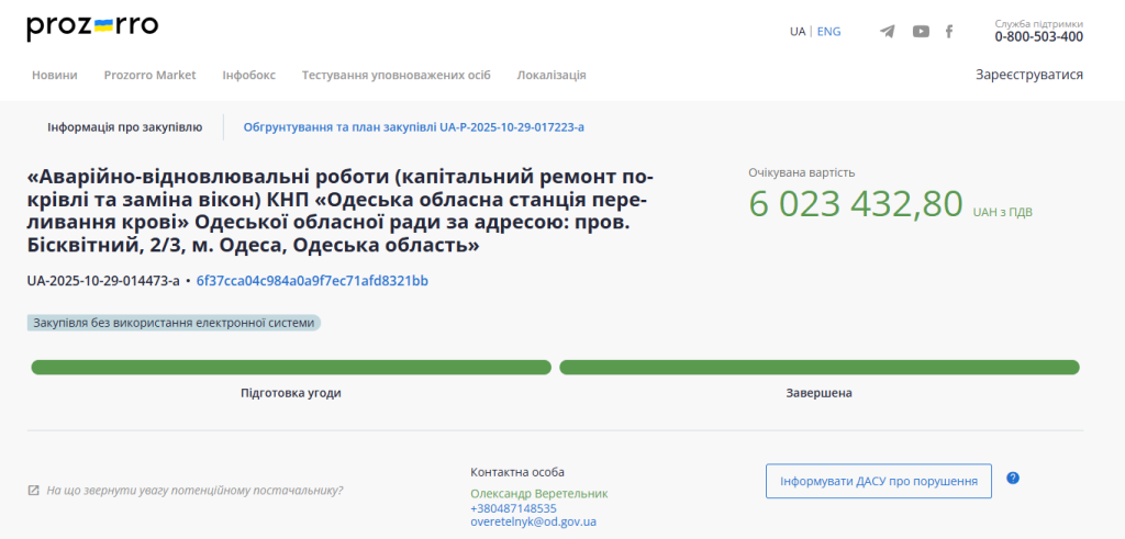 В Одесі без аукціону віддали компанії 6-мільйонний підряд на капремонт обласної станції переливання крові