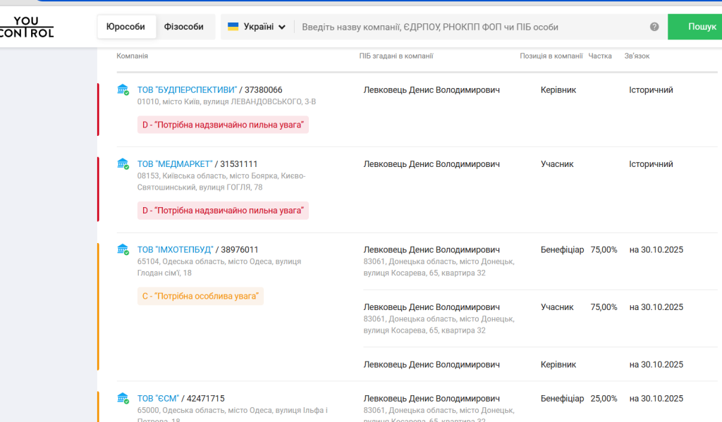 Цікаво, що Денис Левковець значиться керівником 5 компаній та беніфіціаром трьох у різних регіонах країни. Три фірми зареєстровані в Одеській області, одна в Донецькій та ще чотири у Києві, основна маса компаній в досьє позначена як та, що потребує «особливої уваги».