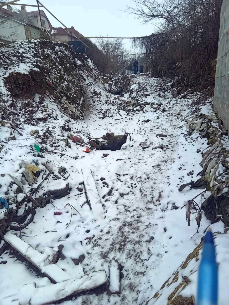 Під час комісійного обстеження було виявлено напівзруйнований підземний колодязь із витоком рідини темного кольору, а також значне скупчення побутових і будівельних відходів. За словами заявниці, сміття було нанесене потоками води під час підтоплення та досі не прибране.