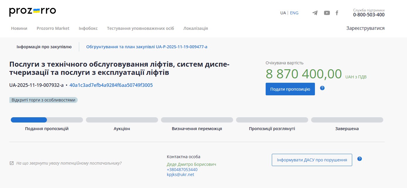Комунальне підприємство «ЖКС «Чорноморський»» шукає підрядника, який цілий рік буде відповідати за технічне обслуговування ліфтів та систем диспетчеризації в житлових будинках Київського району Одеси. Очікувана вартість закупівлі становить 8,87 млн гривень, а пропозиції від учасників приймають до 27 листопада 2025 року.