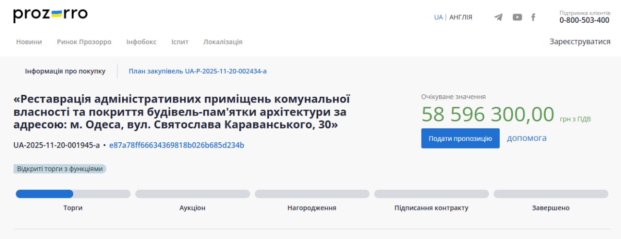 Управління капітального будівництва Одеської міської ради замовило реставрацію адміністративних приміщень та покриття будівлі-пам'ятки архітектури на вулиці Святослава Караванського, 30 (колишня Жуковського) за 58 596 300 гривень.