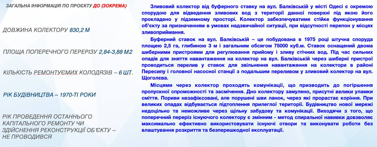 Петро Обухов стверджує, що ці проєкти передбачають приведення до ладу, очищення, латання дір та прокладання нових пластикових труб в теперішньому старому колекторі. Довжина двох ділянок – 733 м та 830 м. Це б дозволило зливати воду з буферного ставка на Балківський в дощовий колектор на Щоголєва й, таким чином, за словами розробників проєктів, Балківську та Пересип під час дощів затоплювати не буде.
