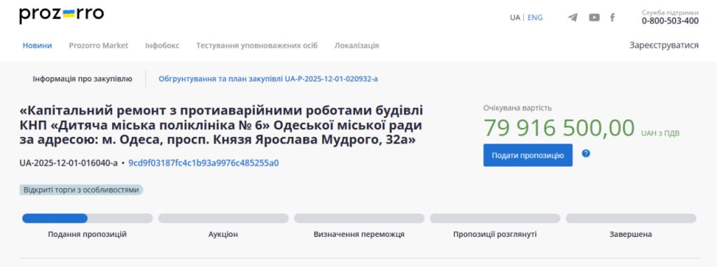Тендер на виконання робіт відкритий до 16 грудня 2025 року.