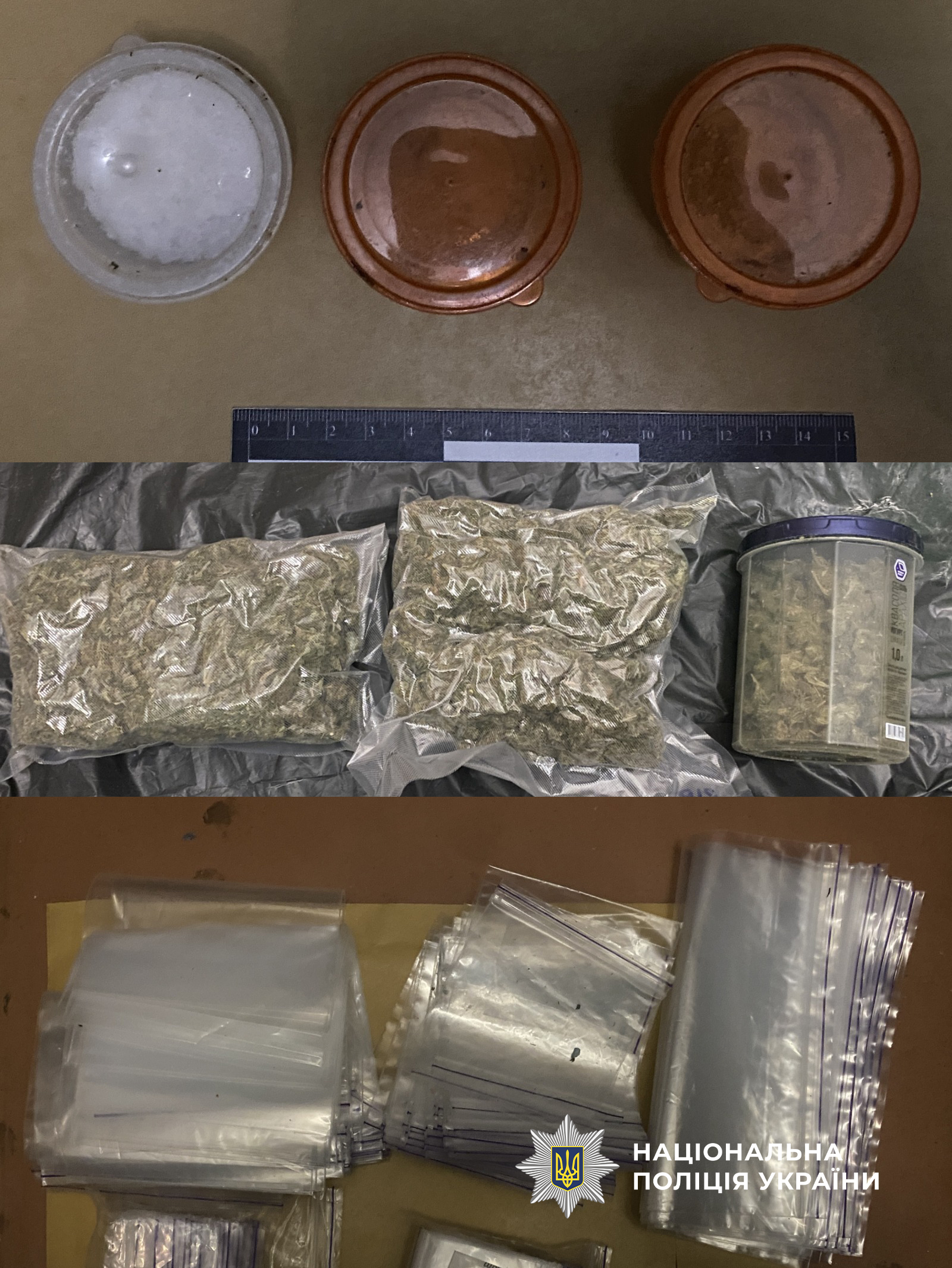 Правоохоронці вилучили полімерні контейнери та пакети з пігулками різних кольорів, а також суміші синтетичного та рослинного походження.