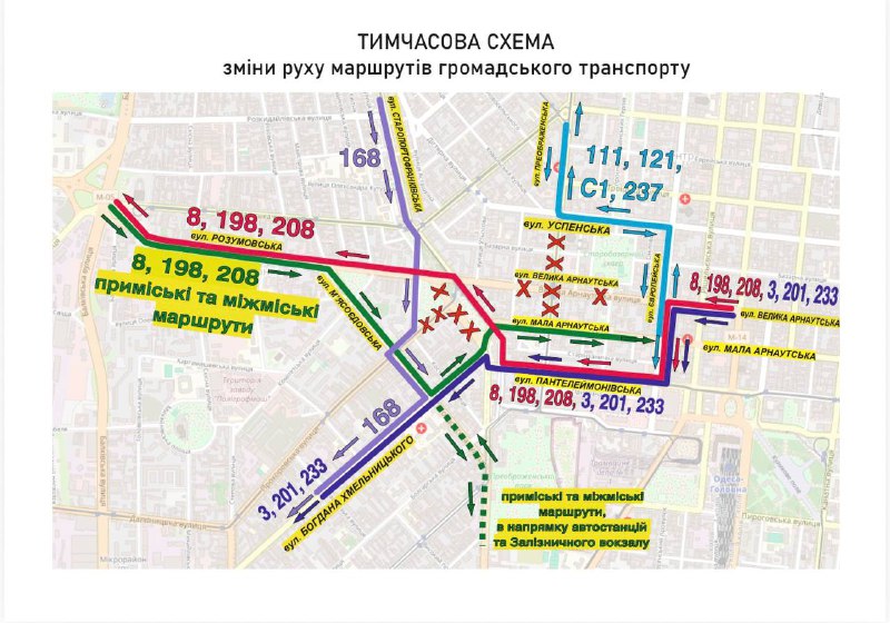 - вулиця Розумовська, вул. М’ясоєдовська, вул. Богдана Хмельницького, вул. Мала Арнаутська та далі за схемами руху (для автобусних маршрутів приміського та міжміського сполучення, які рухаються в напрямку Залізничного вокзалу та автостанцій по вул. М’ясоїдівській на вул. Мечнікова, пров. Високий, вул. Водопровідна, площа Старосінна).