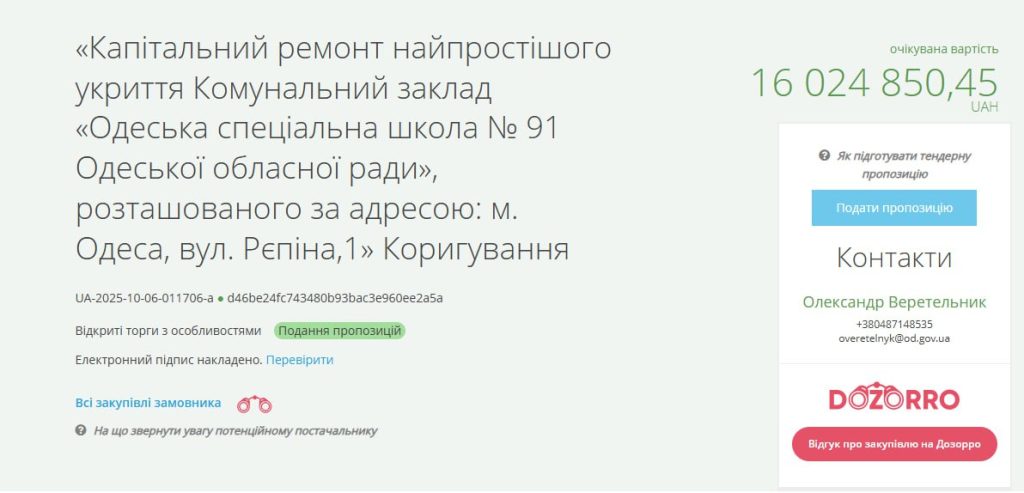 Департамент капітального будівництва Одеської міської ради оголосив тендер на Капітальний ремонт найпростішого укриття Одеської спеціальної школи № 91 на Рєпіна, 1. Очікувана вартість тендерної пропозиції становить 16 024 850 гривень.