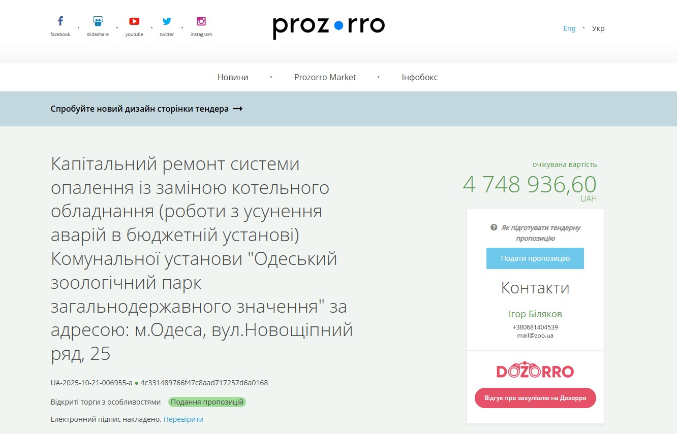 Про це йдеться у тендері, опублікованому 21 жовтня на порталі Prozzoro, повідомляє Українська Служба Інформації.