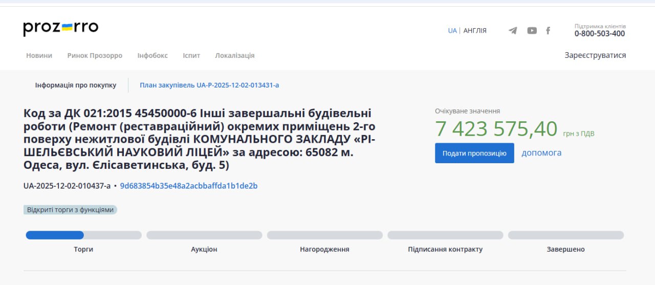 Рішельєвський науковий ліцей оголосив тендер на завершальні будівельні роботи (реставраційний ремонт) окремих приміщень 2-го поверху за майже 7,5 мільйонів гривень.