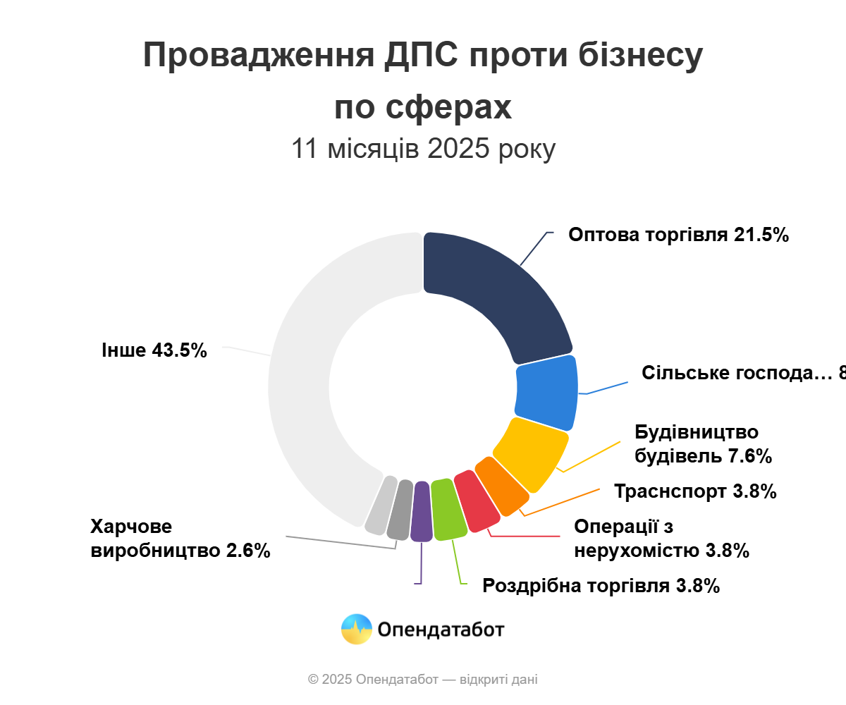Йдеться про виконавчі провадження про стягнення штрафів, податків та зборів з бізнесу на користь податкової інспекції. Кожне 5 провадження відкрито цьогоріч проти бізнесу у сфері оптової торгівлі – 5 380 справ. На другому місці розташована сфера сільського господарства та мисливства – 2 092 провадження, та будівництво – 1 910 справ.