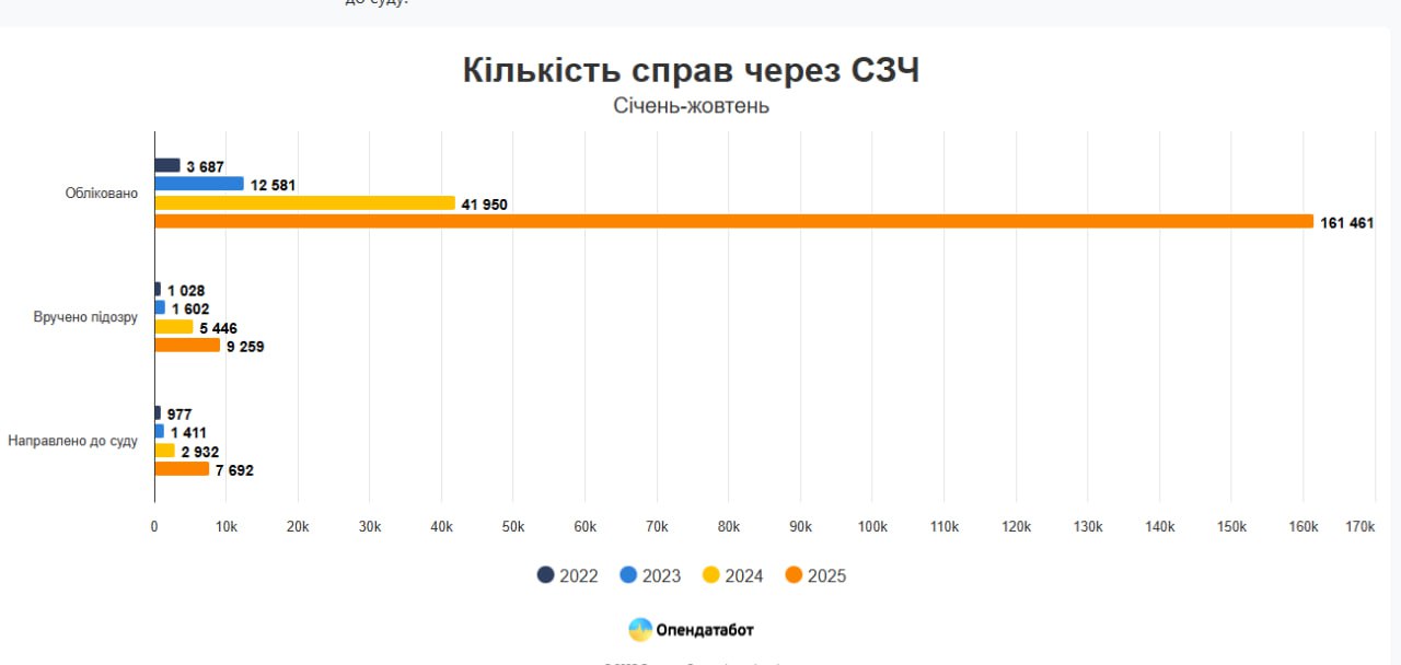 Попри рекордну кількість проваджень підозру отримали лише 9,3 тисячі військовослужбовців — це близько 6% від усіх зареєстрованих справ, а до суду дійшли лише 5%. Для порівняння, ще у 2022 році кожна п’ята справа доходила до суду.