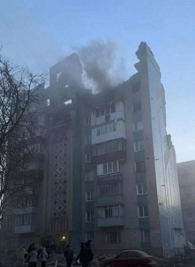 У місті пошкоджено два житлових 9-поверхових будинки: в одному пожежа, в іншому — руйнування з 3-го по 9-й поверх. Рятувальники продовжують евакуювати людей із заблокованих квартир.