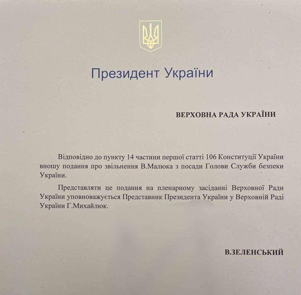 Зеленський подав до Верховної Ради документ про звільнення Малюка з посади голови СБУ.