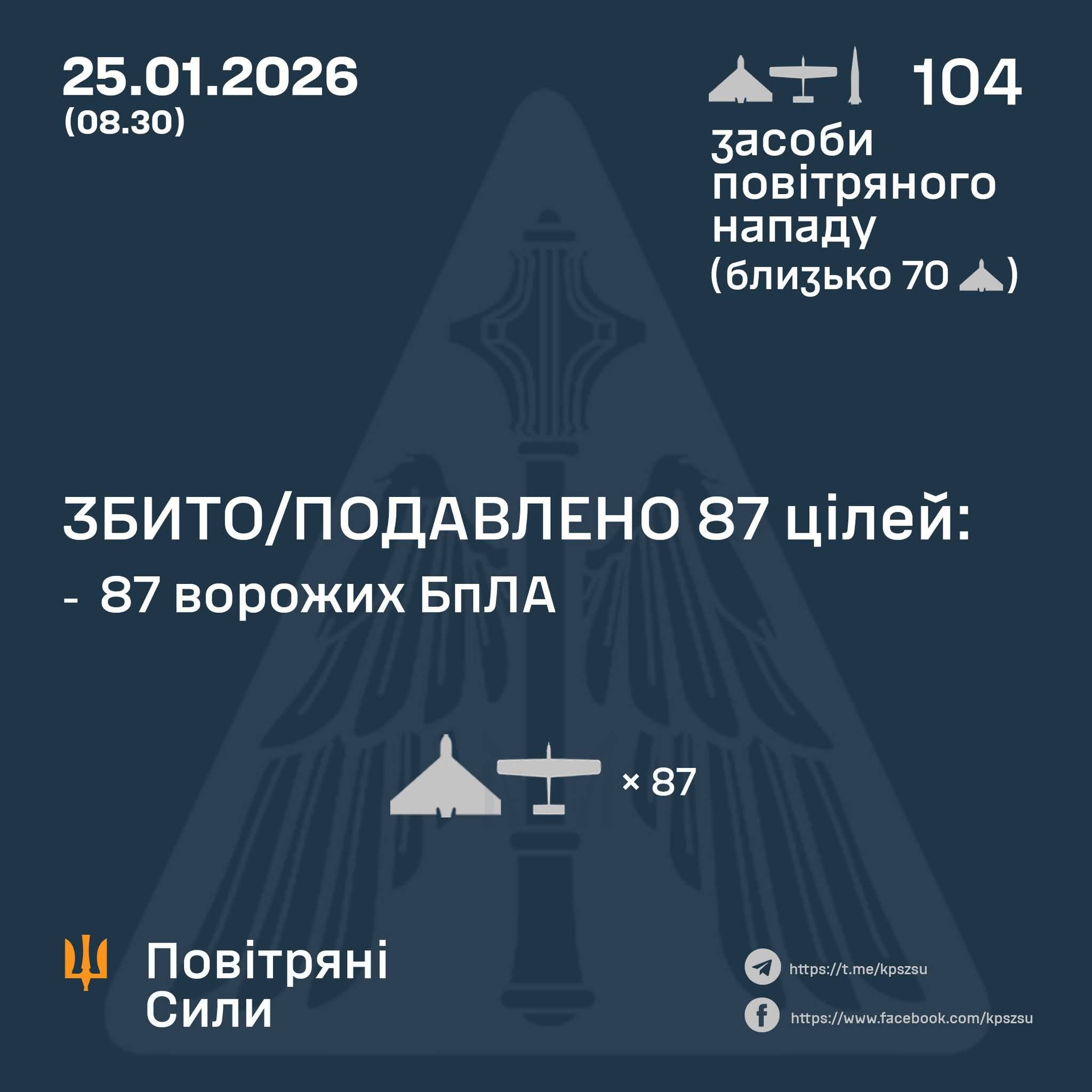 У ніч на 25 січня (з 18:30 24 січня) противник атакував двома балістичними ракетами Іскандер-М/зенітними керованими ракетами С-300 із Брянської обл., а також 102 ударними БпЛА типу Shahed, Гербера і безпілотниками інших типів із напрямків: Курськ, Орел, Брянськ, Шаталово – рф., ТОТ Донецьк, близько 70 із них – “шахеди”.