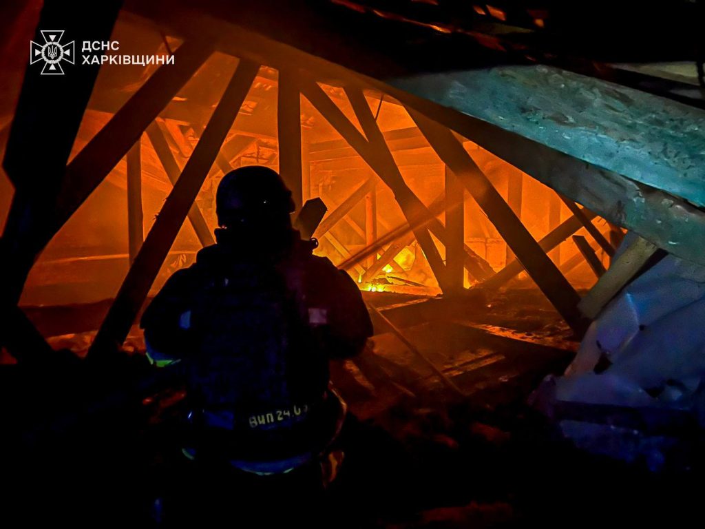 На Харківщині росіяни атакували адміністративну будівлю, там виникла пожежа. Внаслідок вибухів зайнявся дах двоповерхової будівлі на площі 100 м кв.