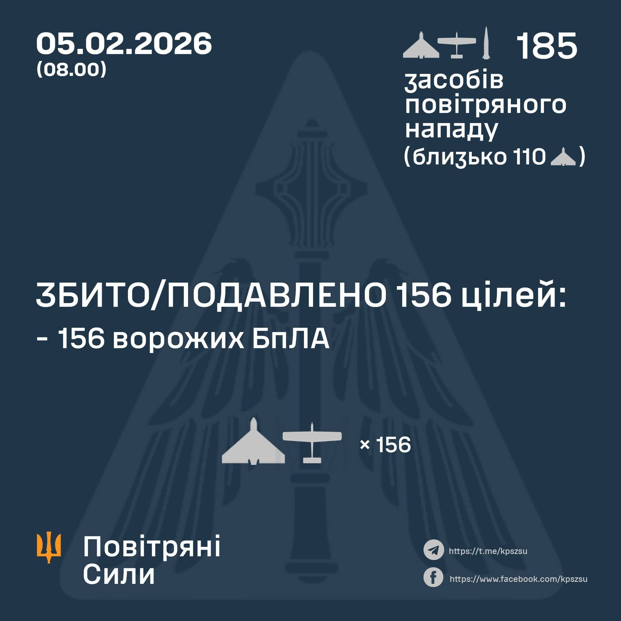За попередніми даними, станом на 08:00, протиповітряною обороною збито/подавлено 156 ворожих БпЛА.