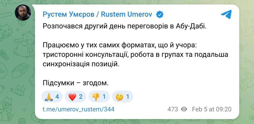 Почався другий день переговорів в Абу-Дабі. Зараз делегації знову працюватимуть у тристоронньому форматі Україна-США-РФ.