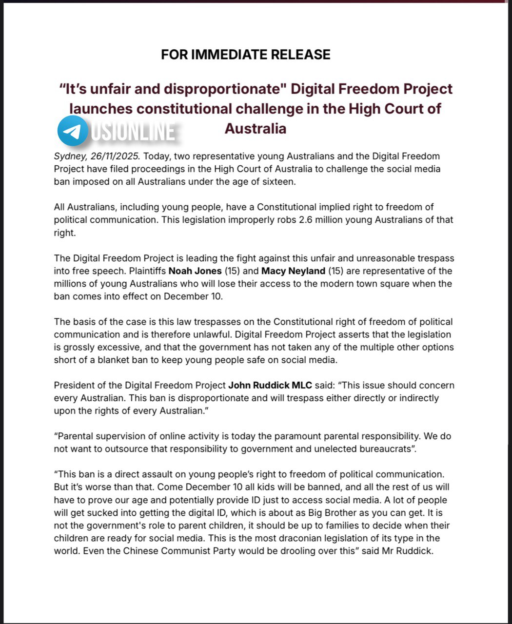 Двоє 15-річних — Ноа Джонс і Мейсі Нейланд — разом із Digital Freedom Project подали позов до Верховного суду Австралії.