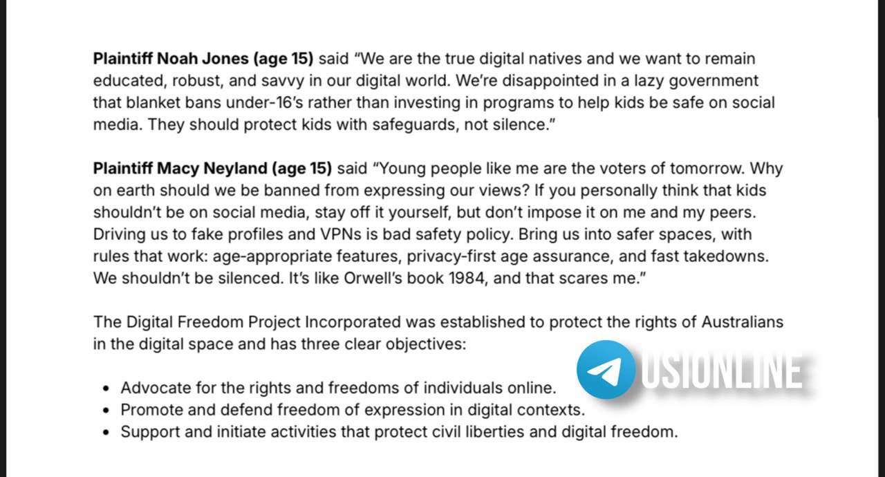 Двоє 15-річних — Ноа Джонс і Мейсі Нейланд — разом із Digital Freedom Project подали позов до Верховного суду Австралії.