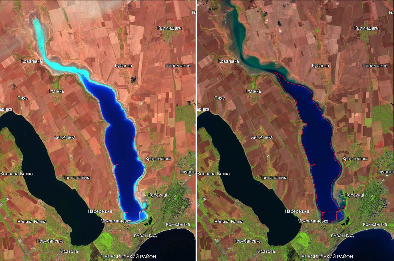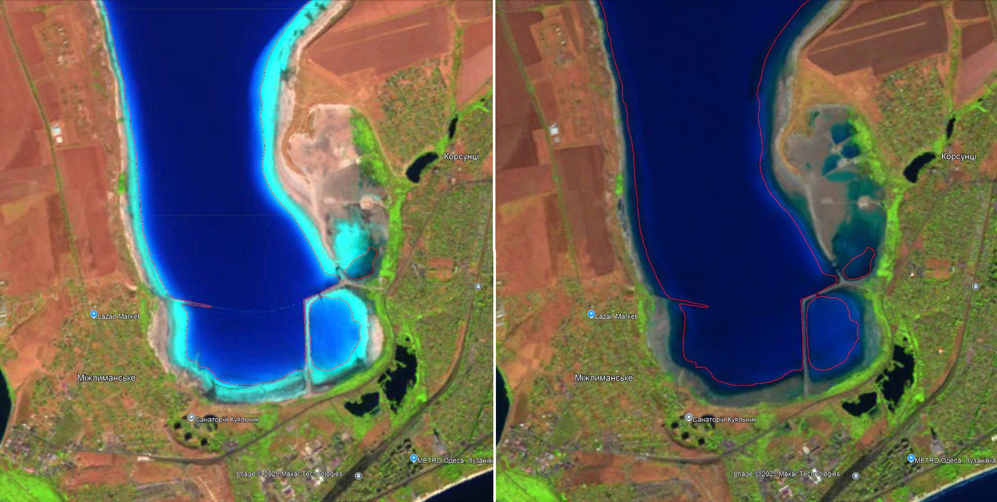 Злива 30 вересня 2025 року виявилася рятівною для нього – рівень води значно піднявся за останній час. Про це свідчать рівні води на супутникових знімках за 28.09.2025 (ліворуч) та 05.10.2025 (праворуч). Кольорові лінії урізів води наочно все відображають. На скільки зменшиться солоність покаже «фізика-хімія» та лабораторні аналізи води. Оголене дно берегів та заток Куяльницького лиману заповнилося водою, але якою ціною? – написав вчений.