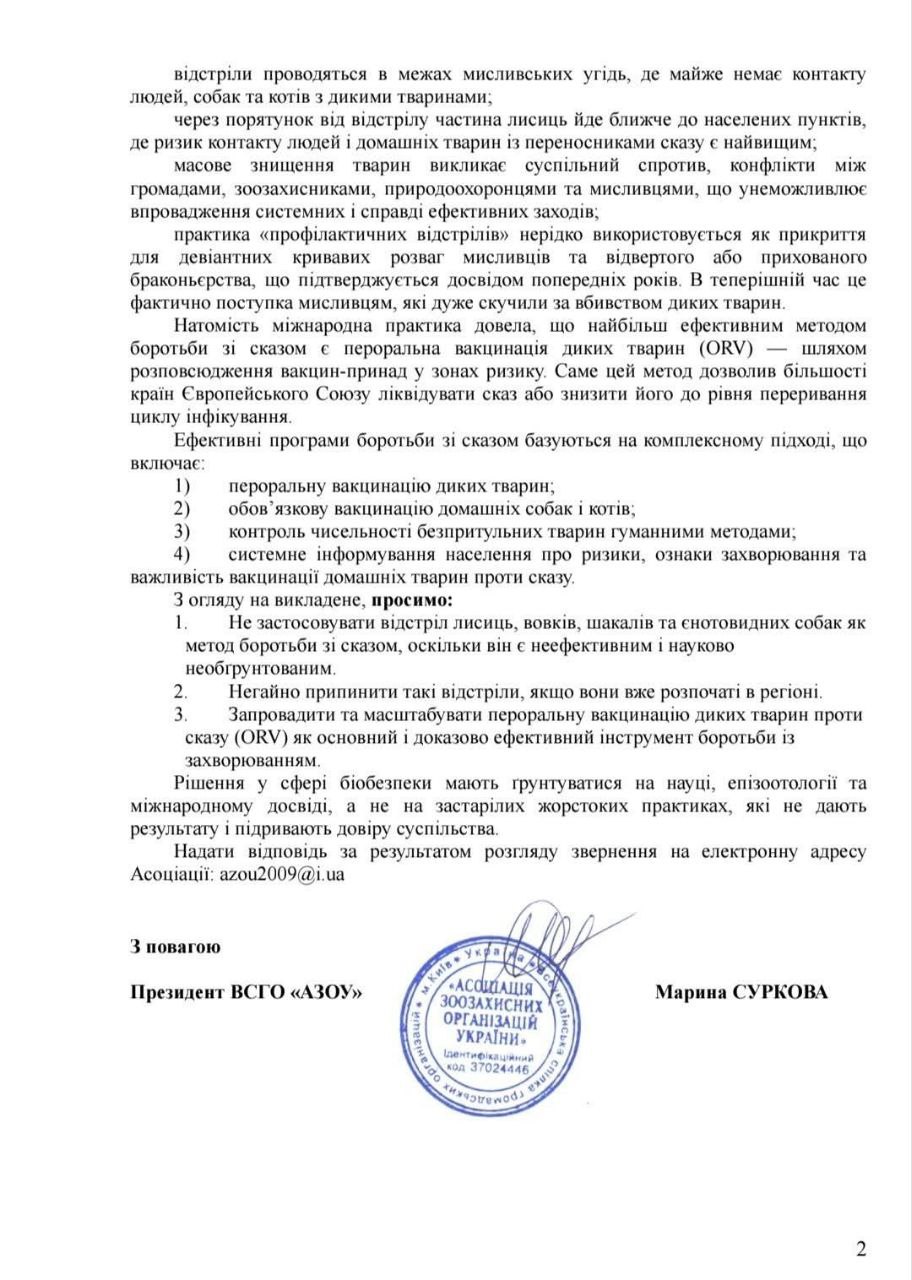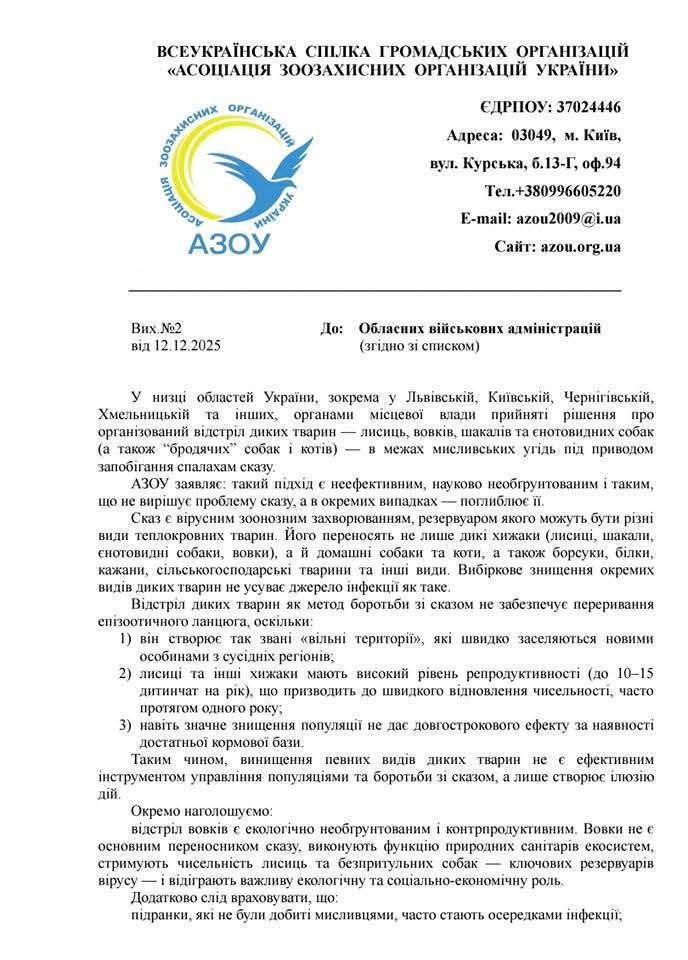 АЗОУ направила листи до 22 обласних військових адміністрацій із проханням не дозволяти відстріл лисиць, вовків, шакалів та єнотоподібних собак. В асоціації наголошують, що сказ — це вірусне захворювання, з яким неможливо боротися зброєю. Його переносять не лише дикі, а й домашні тварини, а також кажани і худоба.